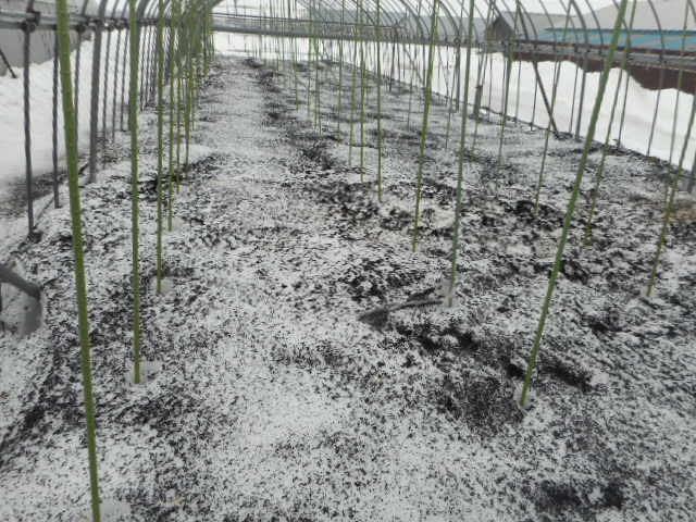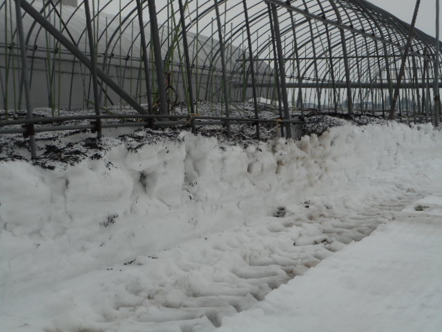 屋根が大きい牛舎は、舎内の暖かさもあり降った雪が